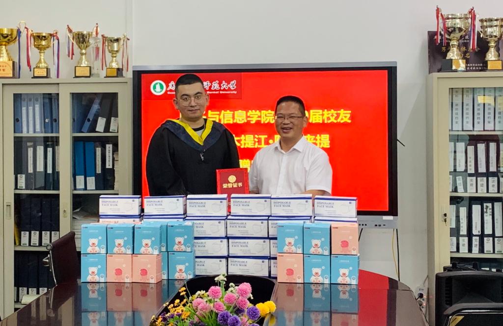 麦合木提江▪阿卜来提表示,母校承载着他的青春和梦想,也见证着他的成长,在毕业离校之际,作为正在创业的少数民族员工捐赠口罩送给抗疫一线的老师和返校的同学们。“非常开心能助力公司的疫情防控工作,感谢党和广师大对我的培养教育,自己一朝是广师大学子,终生要服务广师大的发展!”