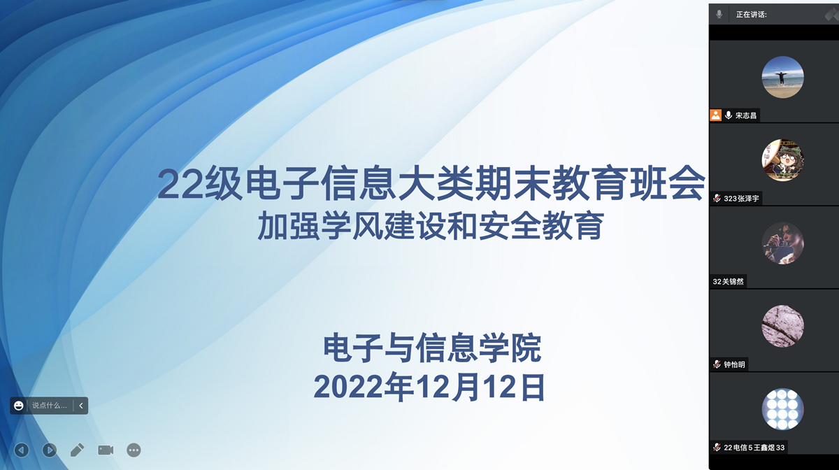班主任和辅导员分别召开班级期末主题班会,从学风建设、期末考试诚信教育、疫情与健康教育、寒假安全教育四个方面向同学们强调了以下几点:一是希望同学们在期末阶段认真复习备考,努力克服线上教学和考试的困难,鼓励同学们组建学习小组互相监督。同时,倡议班干部和员工党员充分发挥先锋模范作用,密切关注学习困难员工的情况,做好学业帮扶和心理疏导工作;二是希望同学们牢固树立诚信考试理念,并通过多个考试作弊的案例引导同学们遵守考风考纪,积极备考、诚信参考;三是希望员工当好自己健康的“第一责任人”,及时关注和报告自身健康状况,做好个人日常防护。同时,在校同学减少不必要外出和社会面接触,如有不适症状及时就医;四是希望同学们注意假期安全,通过案例警醒同学们在假期注重人身财产安全、交通安全和食品安全,度过一个充实美好的假期。