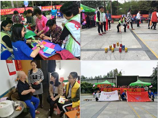 早上七点四十五分,青协全体成员和志愿者在新篮球场集合并签到后,带着物资前往棠德社区,此次活动共设六个摊位,其中包括电子协会的义修摊位、折纸摊位和四个游戏摊位等。刚布场完毕就吸引了许多社区居民,志愿者热情地引导前来参加活动的居民。居民们积极参与到活动中,拿到了精美实用的礼品后十分开心。其中“排山倒海”和“套住你的心”活跃了气氛,让居民们“动”起来了;“爱心接力”通过不一样的方式增加了居民间的互动;“就不听你的”不仅活跃了居民的思维能力,而且锻炼了居民的肢体协调能力。阿姨们和小朋友们认真地跟着志愿者们学习折纸,折出一个个精巧别致的小东西。有些居民拿着损坏的电器前来维修,电子协会的志愿者们用自己的专业技术帮居民修好了电器。十点左右,分好组的志愿者们在社工的带领下,带着礼品去看望孤寡老人,与他们聊天谈心。中午十二点,活动接近尾声,全体成员开始收摊并合影留念。