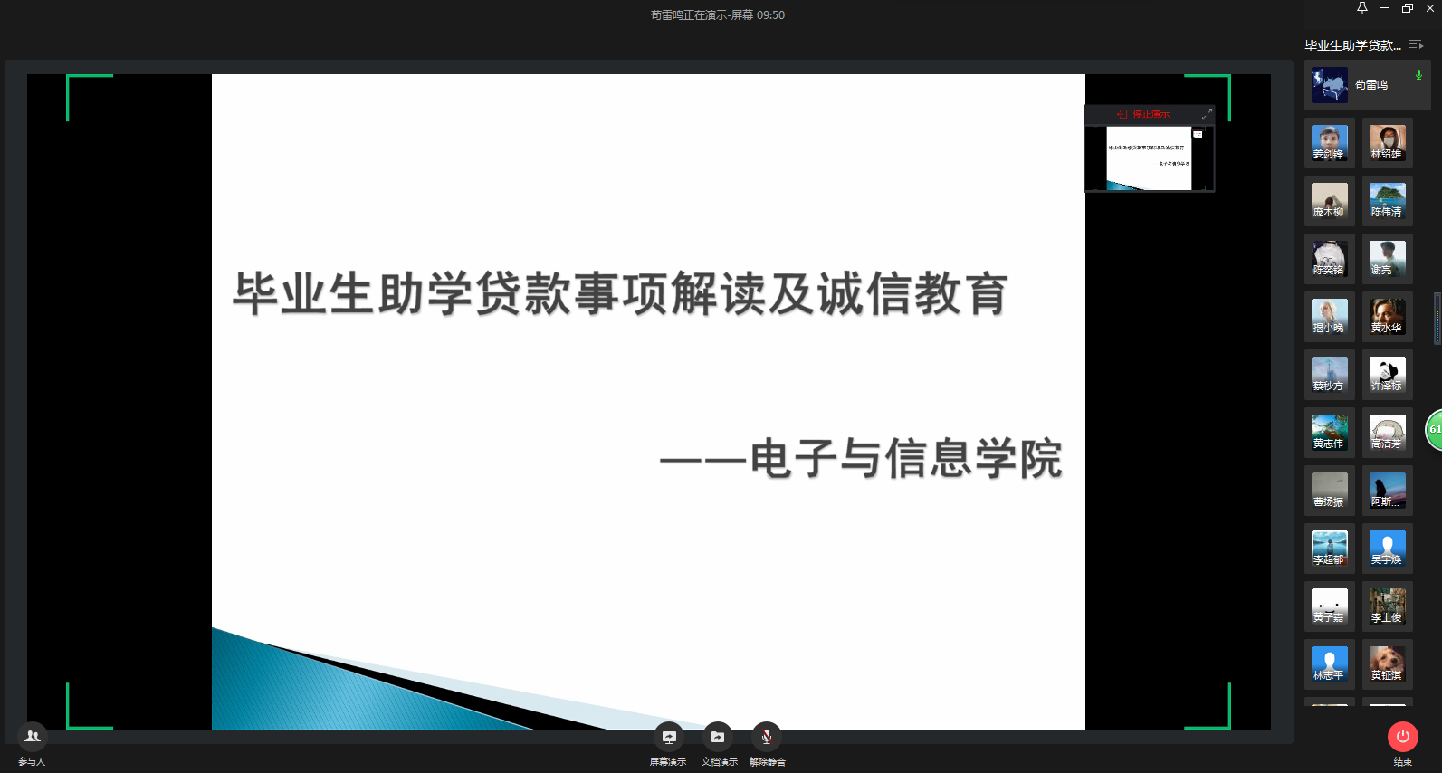 毕业在即,为做好公司国家助学贷款毕业生还款工作,加强毕业生诚信还款意识,6月10日晚,bevictor伟德官网采取线上“座谈会”的形式为全院贷款毕业生详细解析了毕业还款注意事项,并进行了展开了诚信教育,以树立员工诚实做人,诚信还款的意识,保证毕业生还贷事宜的顺利进行。